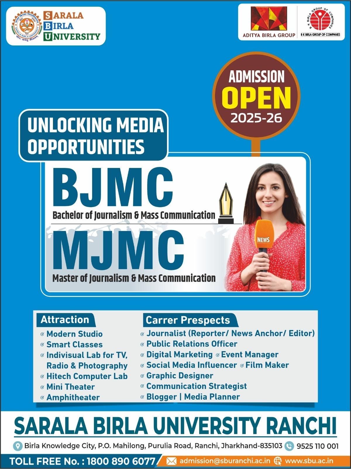 Sarala Birla University offers a 𝑩𝒂𝒄𝒉𝒆𝒍𝒐𝒓 𝒐𝒇 𝑱𝒐𝒖𝒓𝒏𝒂𝒍𝒊𝒔𝒎 𝒂𝒏𝒅 𝑴𝒂𝒔𝒔 𝑪𝒐𝒎𝒎𝒖𝒏𝒊𝒄𝒂𝒕𝒊𝒐𝒏 & 𝑴𝒂𝒔𝒕𝒆𝒓 𝒐𝒇 𝑱𝒐𝒖𝒓𝒏𝒂𝒍𝒊𝒔𝒎 𝒂𝒏𝒅 𝑴𝒂𝒔𝒔 𝑪𝒐𝒎𝒎𝒖𝒏𝒊𝒄𝒂𝒕𝒊𝒐𝒏 with exceptional learning outcomes including world-class infrastructure, renowned faculty, and assured support for internships and placements at leading organisations. Admissions are open for session 2025-26. Apply Now – https://shorturl.at/4zlry